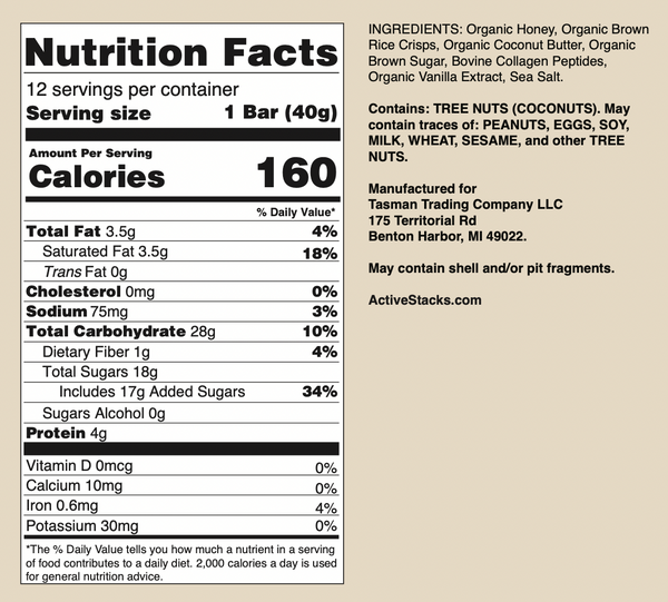 Organic honey, organic brown rice crisps, organic coconut butter, organic brown sugar, bovine collagen peptides, organic vanilla extract, sea salt.